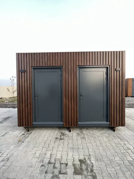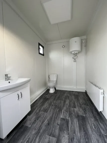 Este contenedor doble para inodoros está diseñado para proporcionar un confort óptimo en cualquier entorno. Fabricado en resistente cartón Obornicka de 6 cm de grosor, está equipado con todas las instalaciones esenciales, incluida la fontanería completa para agua y alcantarillado, y una fuente de alimentación estándar de 230 V. Un calentador de agua instantáneo garantiza un suministro continuo de agua caliente junto al grifo.